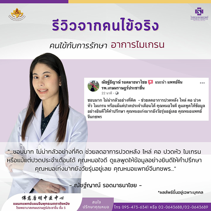 "มารักษาอาการปวดหัว ไมเกรน มีการอาการปวดมาก ปวดทั้งวันทั้งคืนและได้มารักษาฝังเข็มกับคุณหมอพันนิดา...