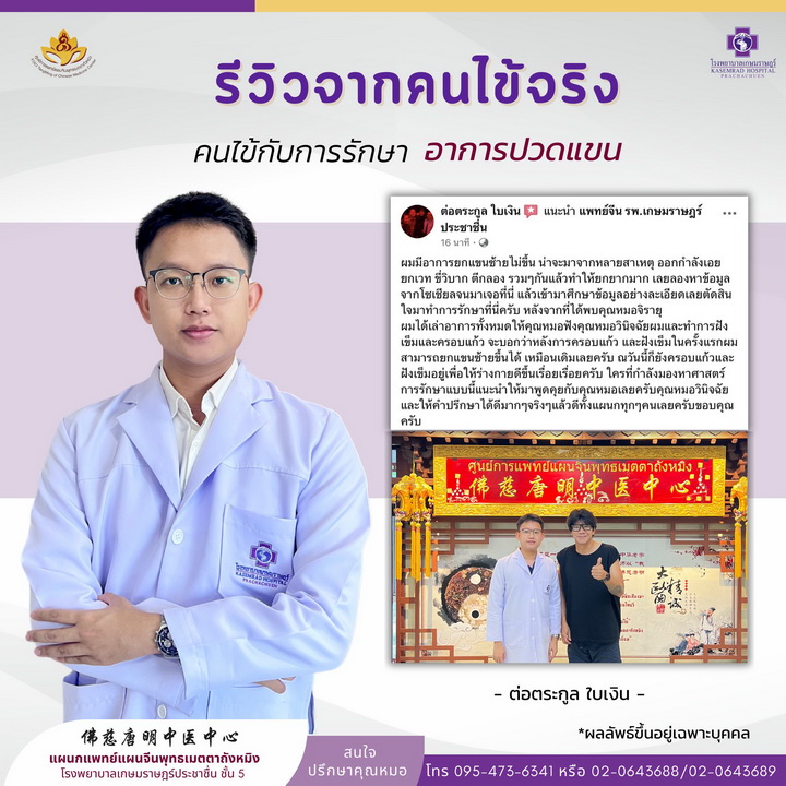 "ขอบคุณทีมแพทย์แผนจีน ภูมิตก หลังจากรักษาด้วยการฝังเข็ม 6 ครั้ง รู้สึกดีขึ้น ขอบคุณอีกครั้งนะคะ" - ภัทรฤดี ภักดีบุรุษ -