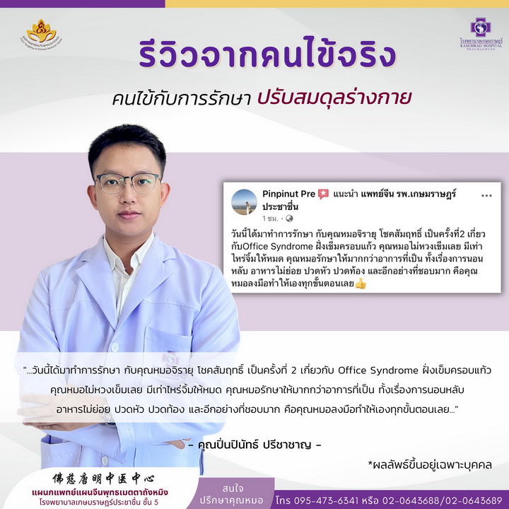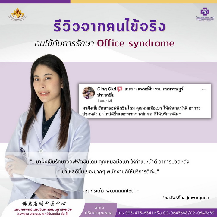 "...รักษาอาการออฟฟิสซินโดรมกับทางคุณหมอกชพรแล้วอาการดีขึ้นเยอะมาก คุณหมอมือเบา...