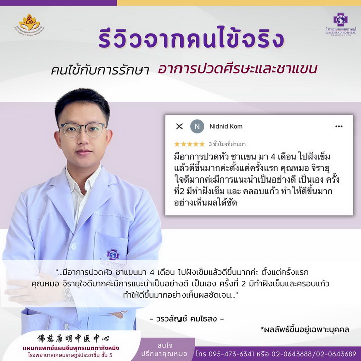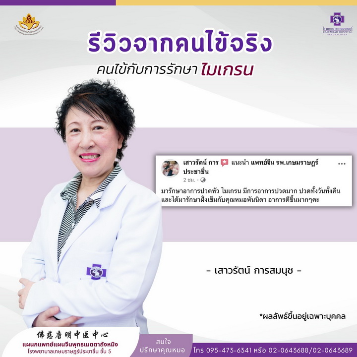 "มารักษาอาการปวดหัว ไมเกรน มีการอาการปวดมาก ปวดทั้งวันทั้งคืนและได้มารักษาฝังเข็มกับคุณหมอพันนิดา...