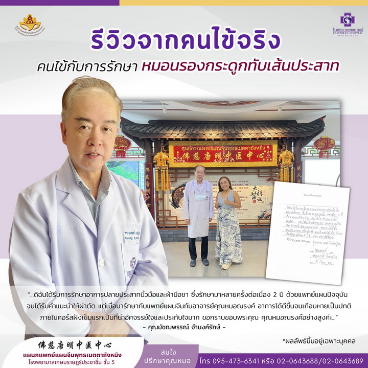 “...ดิฉันได้รีบการรักษาอาการปลายประสาทนิ้วมือและฝ่ามือชา ซึ่งรักษามาหลายครั้งต่อเนื่อง 2 ปี...