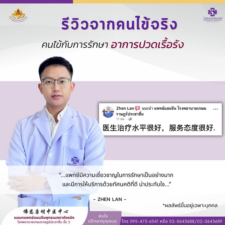 รพ.เกษมราษฏร์ มีความเพียบพร้อมด้วยบุคคลากรทางการแพทย์ และสมุนไพรจีนพร้อมดูแลผู้ป่วยระยะแรกเริ่มจนถึงโรคเรื้อรังด้วยศาสตร์การแพทย์แผนจีน อาทิ เช่น ฝังเข็ม ครอบแก้ว นวดทุยหนา กวาซา สมุนไพรจีน โดยแพทย์จะเลือกใช้วิธีรักษาตามความเหมาะสมของโรค ไม่เพียงแต่ให้แค่การรักษาเท่านั้น เรายังเน้นให้ผู้ป่วยปรับพฤติกรรมการใช้ชีวิตเพื่อช่วยเพิ่มประสิทธิภาพของผลการรักษาให้ดียิ่งขึ้น